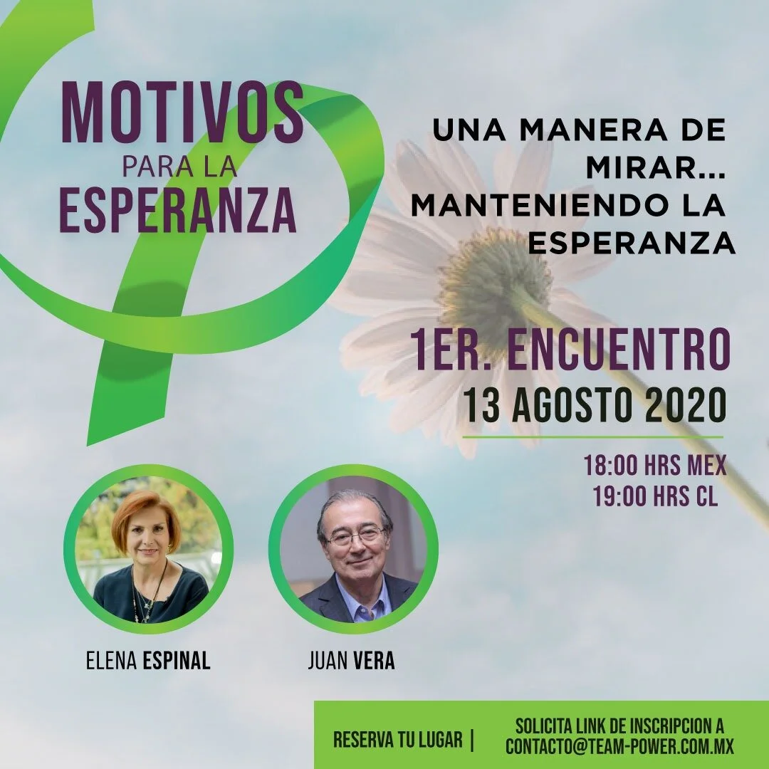 Regresar a todos los eventos Ciclo junto a Elena Espinal - "Motivos para la esperanza". Primer encuentro jueves, 13 de agosto de 2020 6:00 p. m. 7:30 p. m. Google Calendar ICS Serie de encuentros webinar bimensuales en los que buscaremos motivos para que quienes acompañamos podamos alentar la esperanza en otros. Construiremos un espacio para la conversación y apertura acerca de la vida, el propósito y el futuro.Puedes inscribirte aquíHora de presentación: - 6 PM hora de México, Colombia, Perú y Ecuador. - 7 PM hora de Chile. - 8 PM hora de Uruguay, Argentina y Brasil