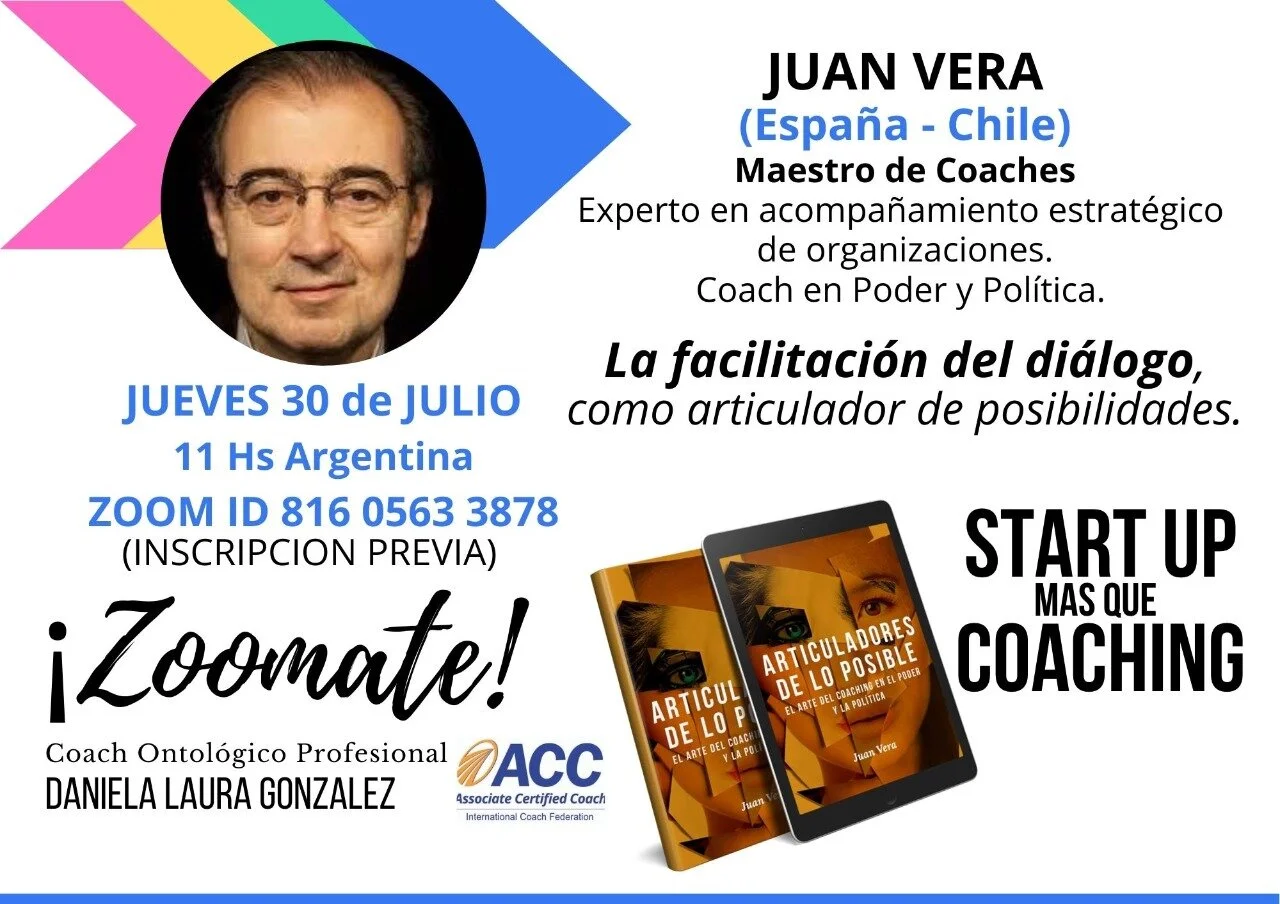 Evento Start Up Argentina (privado) - Charla: "La facilitación del diálogo, como articulador de posibilidades" jueves, 30 de julio de 2020 10:00 a. m. 11:00 a. m. Google Calendar ICS Articulamos cuando logramos construir espacios de diálogo. ¿Qué significa dialogar? ¿En qué espacio se produce el diálogo? Sobre ello versará la charla dirigida al grupo cerrado que lidera Daniela González en Argentina.Este evento no es abierto al público general.Hora de presentación: 10.00 hora Chile.